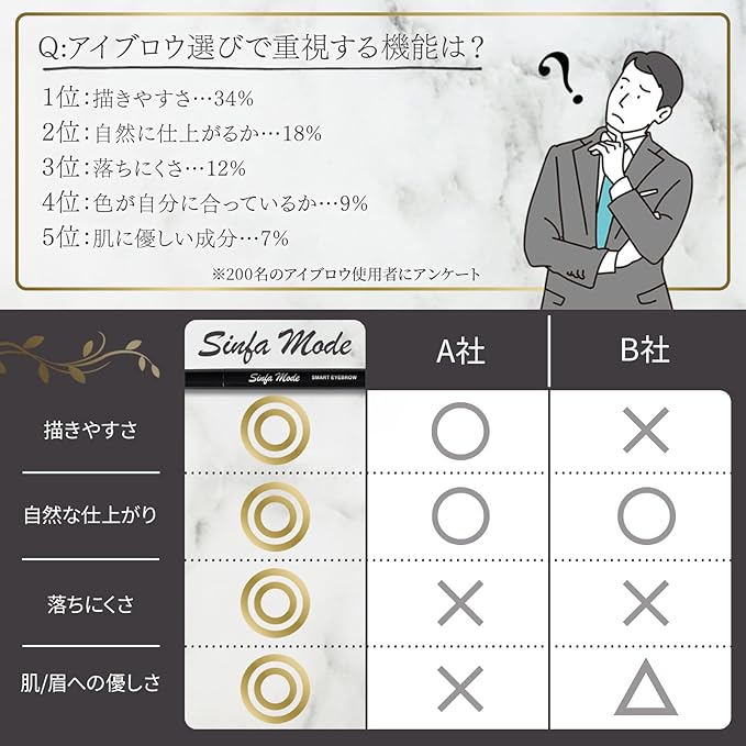 ✅【こんな方におすすめ】①メイク初心者や眉毛を描くのが苦手。②仕事やプライベートで会う人からの好印象をGETしたい。③自分の眉毛が薄かったり、少なかったりして自信を持てない。④色んなアイブロウを試したけど、自分に合ったものを見つけられていない、または満足していない。⑤描いた眉が1日中ずっとキープしてほしい。⑥メイクしてると思われると恥ずかしいので、メイクバレしたくない。