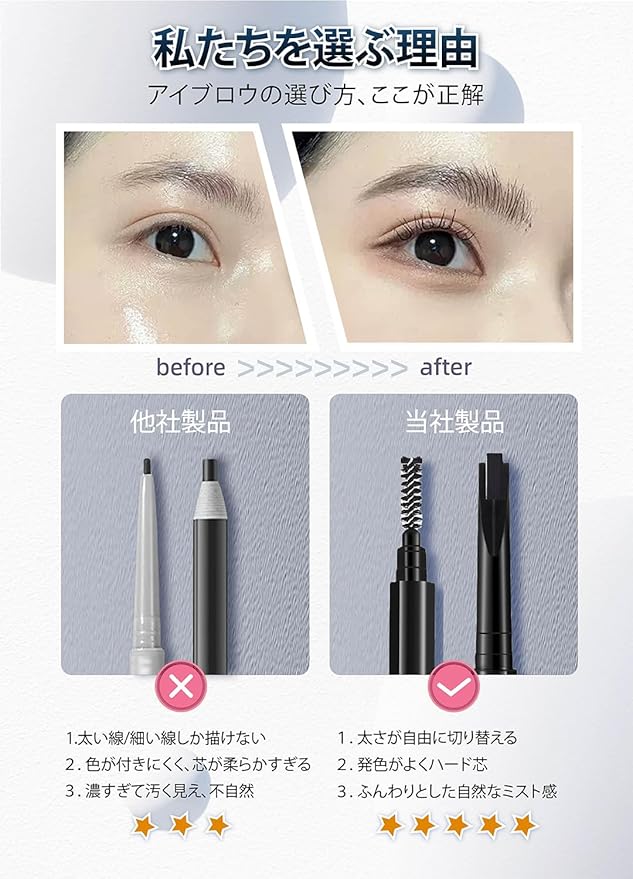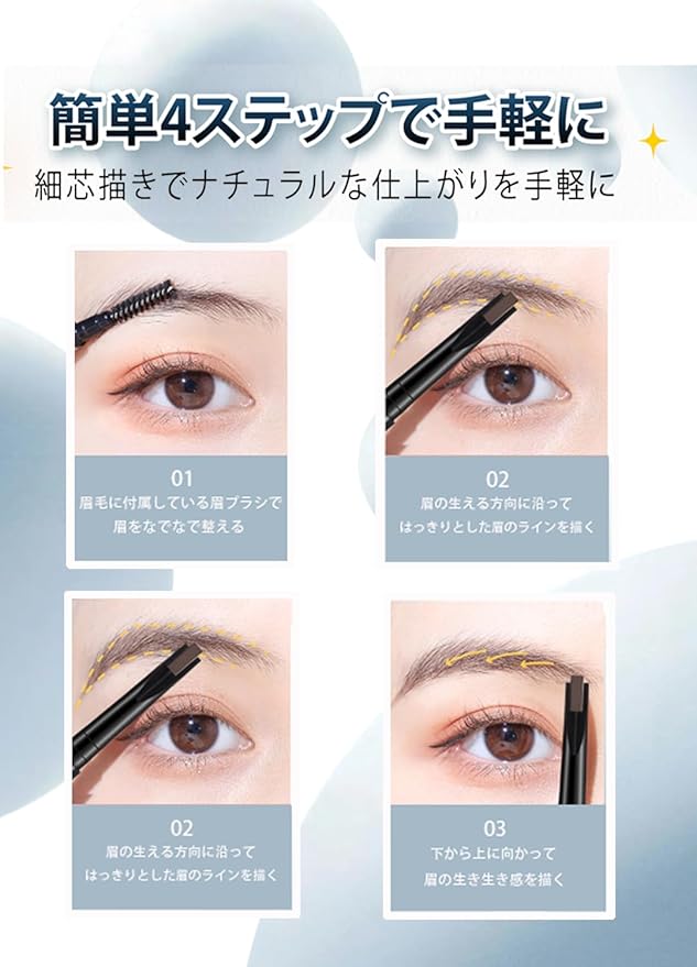【超薄型のペン先】アイブロウペンシルと眉ブラシが一体化され、両頭タイプで二つの効果を一筆で実現できます。独特な形状の極細 0.1 ミリメートルのなめらかな芯は、眉の骨にフィットし、簡単に眉の形を描くことができます。筆芯で細い線も太い線も自在に描ける、細眉ブラシでぼかせばふんわりとした眉毛へ。
