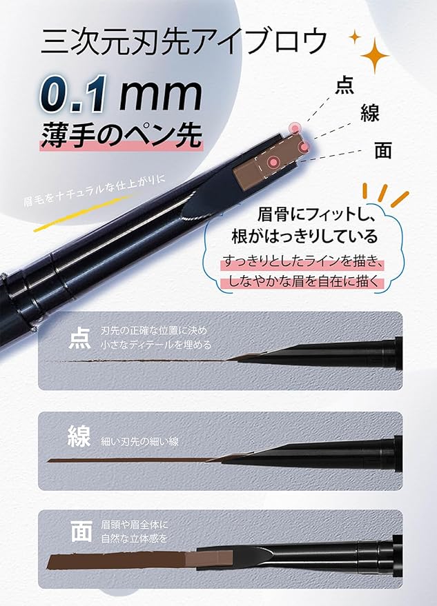 【三次元ナイフブレード眉ペンシル】 この眉ペン、眉ペンシルはクラシックなナイフ型のデザインで、点、線、面の三次元的な描き方で、太さを簡単にコントロールでき、リアルな眉を簡単に描くことができます。狭い面のナイフブレード部分では、細やかな線を描くことができます。広い面のナイフ面では、なめらかな面取りにより、広い面積に色を塗ることが可能です。ナイフの先端部分では、正確な位置決めができ、小さな細部を埋めることができます。