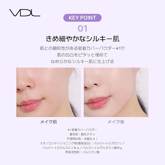 【きめ細やかなシルキー肌】密着カバーパウダーが肌に肌にピタッと密着し、凹凸をやさしく埋めて、なめらかなシルキー肌に仕上げます