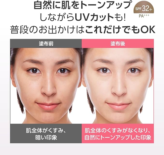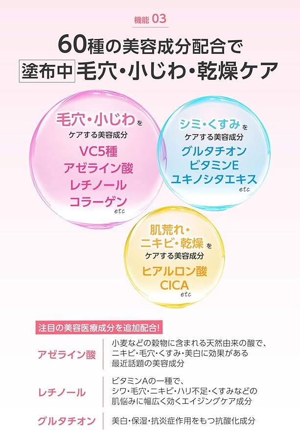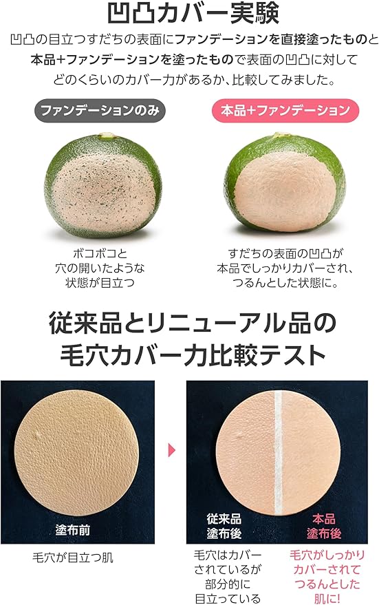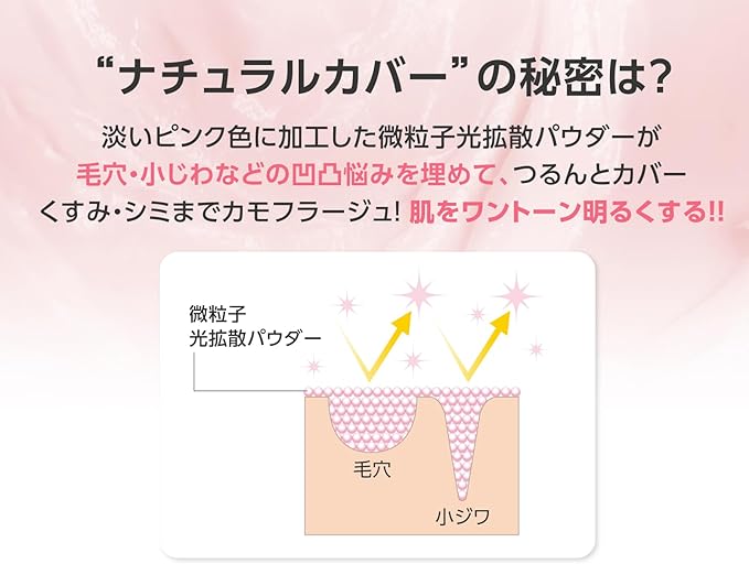 ✨光拡散パウダーを配合し、肌表面に自然な輝きを与え、くすみゼロ。光を反射することで凹凸を目立ちにくく、肌色をトーンアップします。引き締め成分として100倍浸透型ビタミンC配合。気になる毛穴開きもブロックします。