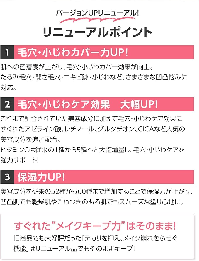 ✨52種の美容成分を贅沢に配合。毛穴ケア成分としてビタミンC、小じわケア美容液成分としてマイクロコラーゲンやアロエエキス、保湿成分としてスーパーヒアルロン酸やヘチマエキス… 化粧下地として毛穴を隠すだけでなく、美容液のように美しい肌に導く処方です。