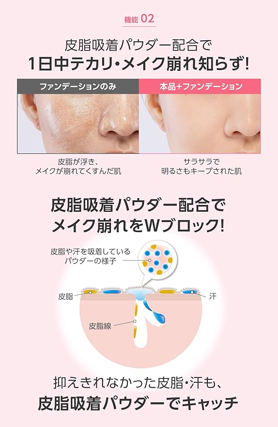 ✨皮脂吸着パウダーが余分な皮脂を吸いとり、超微粒子ストレッチパウダーがパテのように毛穴やしわの凹凸を埋めます。ストレッチパウダーは表情の動きに合わせて形状を変化させるため、1日中よれずに、滑らかな肌をキープ。