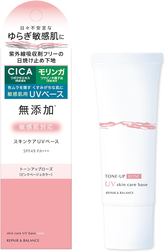 ゆらぎ敏感肌の方にとって、紫外線による日やけは肌トラブルのもと。リペア&バランスのスキンケアUVベースは、紫外線吸収剤を使用していないのにSPF49 PA+++の高UVカット率。お肌をやさしくしっかり守ります。
