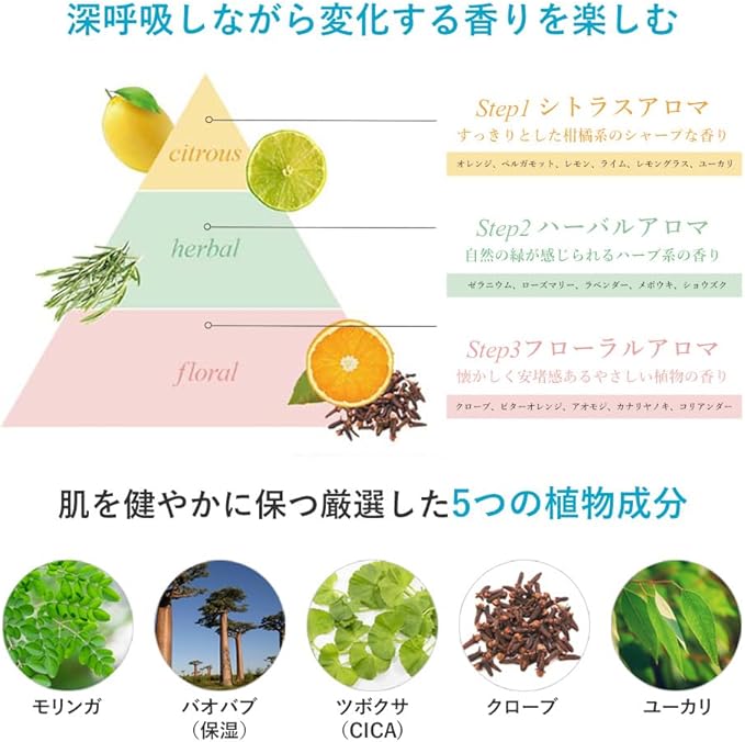 5つのフリー処方でありながらも、肌と心を同時にケアしたいという想いからやさしい植物の香りを採用。合成香料を使用せず、エッセンシャルオイルを使用しています。