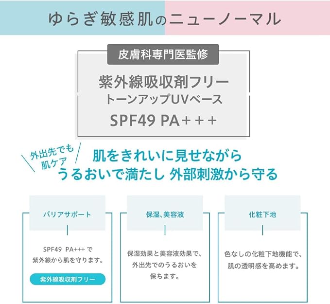 創業当時から受け継ぐ肌研究と、肌の水分・油分の季節ごとの変化を蓄積したデータをもとに処方。皮膚科専門医監修の、ゆらぎ敏感肌に安心処方のトーンアップUVです。