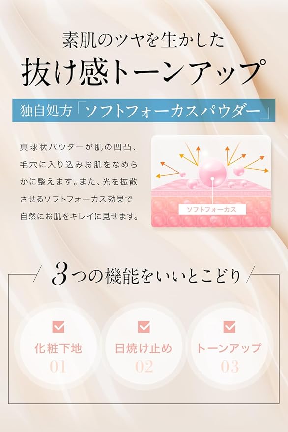 独自処方「ソフトフォーカスパウダー」を使用。真球状パウダーが肌の凹凸、毛穴に入り込みお肌をなめらかに整えます。また光を拡散させるソフトフォーカス効果でお肌をキレイに見せます。 クリーム色は、肌に馴染むナチュラル 抜け感を追求した使いやすいピンクベージュ。伸びがよく、自然な仕上がりになるテクスチャーです。