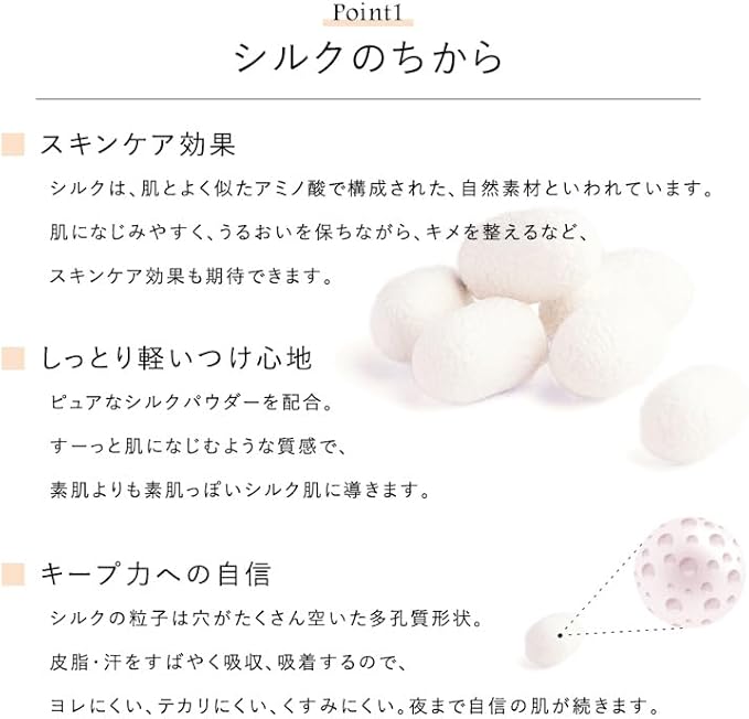 【使用方法】スキンケアと下地でお肌を整えた後、手に1プッシュ出し、少量を指につけて頬→おでこ→鼻→あごの順番で伸ばします。ブラシまたは手で内側から外側に伸ばします。 よりカバー力が欲しい方は、シルクウェットパウダーを重ねてください。 仕上げにフィニッシングパウダーを重ねると、崩れにくくなります。