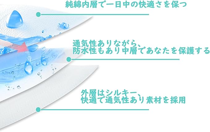 【肌に優しい快適素材】 外側はポリエステル95%、スパンデックス5%のソフトな混紡素材を使用し、裏地は綿100%で肌触りが優れています。通気性と防水性に優れた中間層が、確実な保護を提供し、快適な使用感を実現します。おむつの上からでも使用でき、日常使いに適した設計です。