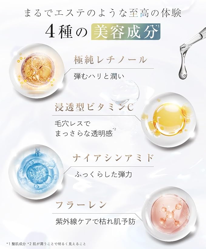 特別な原料 レチノール、ビタミンc、ナイアシンアミド、フラーレン