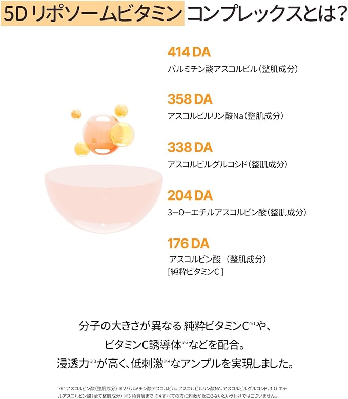 サイズの異なる5種類ビタミンC※1をリポソーム化。新鮮なまま、肌の角質層まで届けます。※1 パルミチン酸アスコルビル、アスコルビルリン酸Na、アスコルビルグルコシド、3-O-エチルアスコルビン酸、アスコルビン酸(全て整肌成分)
