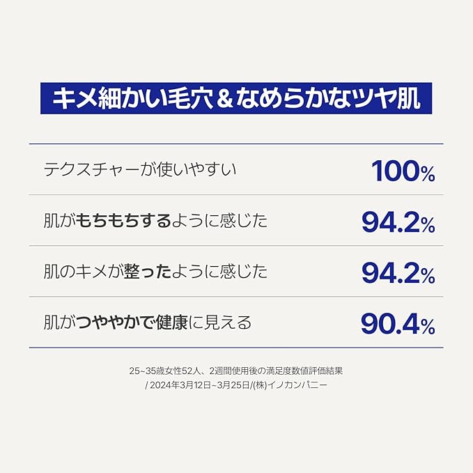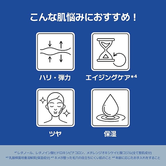 * レチノール、レチノイン酸ヒドロキシピナコロン、メチレンジオキシケイヒ酸コジル(全て整肌成分) * 乳酸桿菌培養溶解質(保湿成分) * キメが整った毛穴の目立ちにくい肌のこと *⁴ 年齢に応じた肌のケアのこと *⁵ 当社比 *⁶ ナイアシンアミド、アデノシン、アラントイン、グリチルリチン酸2K(いずれも保湿成分)