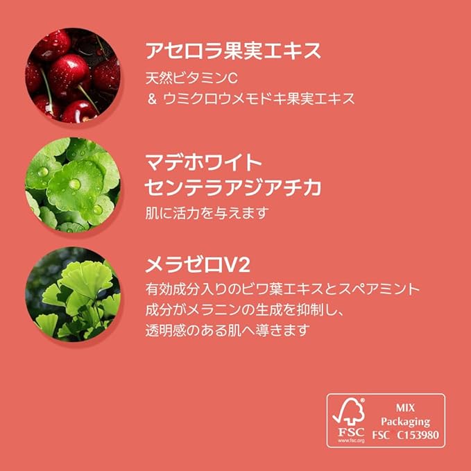 【ダブルビタミン成分】アセロラ抽出物とビタミンの木の実抽出物のビタミン成分が暗い肌印象をより健やかな明るい肌印象へと導きます。