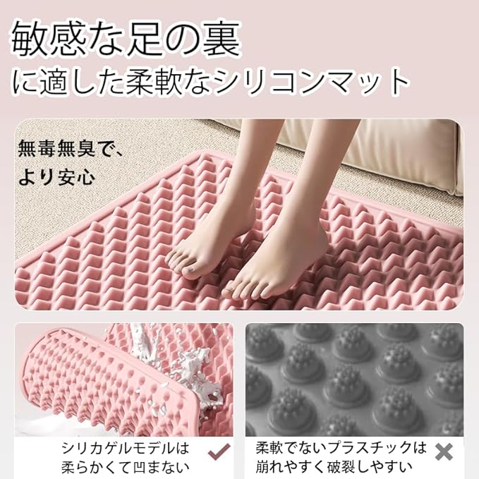 【】マットのツボ刺激により、足部の血流が改善され、浮腫が軽減されるため、足全体の健康状態の向上に寄与します。