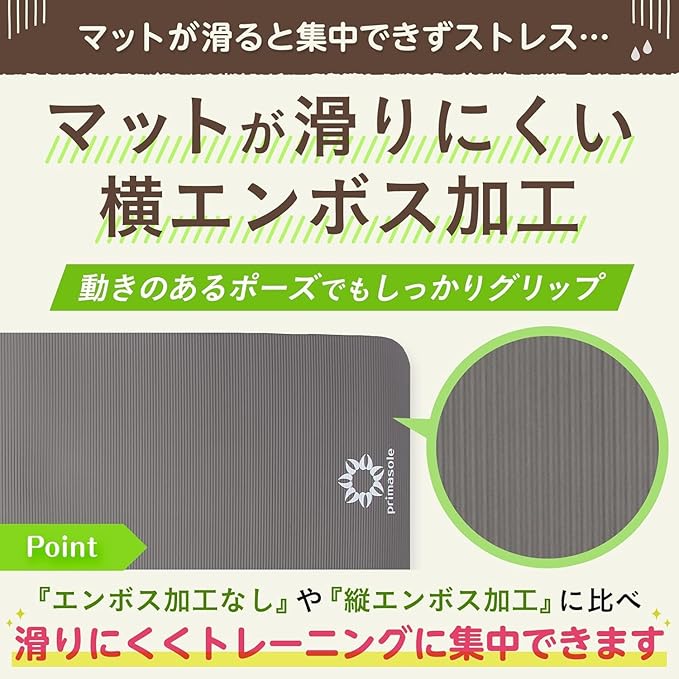 他社のヨガマットで多い縦エンボスだと前後の動きが多いトレーニングやヨガをする際滑ってしまって集中できない。凹凸を横にすることで厚みを残しながらグリップ力もUP!