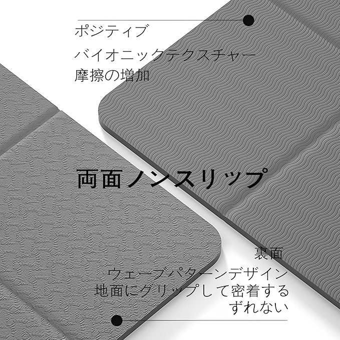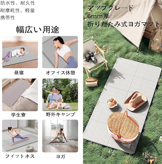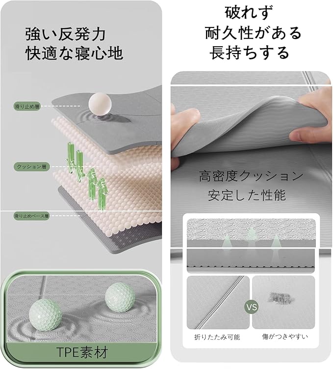製品紹介:この折りたたみヨガマットは、TPE素材を採用しており、肌に直接触れても安全で、健康と環境に配慮した設計です。TPEは柔軟性と弾力性に優れ、高密度な構造により、長期間使用しても変形や破れが起こりにくい特徴を持っています。ヨガマット厚めの6mm仕様で、安定性とクッション性を兼ね備え、ヨガやピラティス、筋トレなどのさまざまなエクササイズに最適です。また、衝撃吸収性が高く、膝や腰への負担を軽減し、快適なトレーニングをサポートします。耐久性に優れているため、頻繁に使用しても劣化しにくく、長く愛用いただけます。さらに、軽量設計で持ち運びが容易であり、自宅やジム、屋外での使用にも便利です。