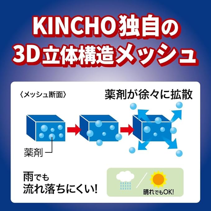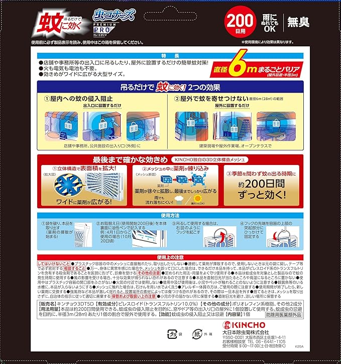 効きめがワイドに広がる大型サイズ。<吊るだけで蚊に効く!2つの効果>①屋内への蚊の侵入阻止:出入口に設置するだけ。店舗や事務所、公共施設の出入り口(外側)に。②屋外で蚊を寄せつけない。直径6m(28m2)の範囲。屋外に設置するだけ。建築現場や作業場、オープンテラスで。<最後まで確かな効きめ KINCHO独自の3D立体構造メッシュ>①立体構造で表面積を拡大!ワイドに薬剤が広がる!②メッシュの中に薬剤が練り込み。薬剤が徐々に拡散し、最後までしっかり広がる。雨でも流れ落ちにくい/晴でもOK!③季節を問わず蚊の出る時期に約200日間ずっと効く!※使用環境により効果は異なります。効きめがワイドに広がる大型サイズ。リサイクルPET→容器【効能】 蚊成虫の侵入阻止又は忌避