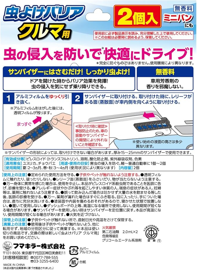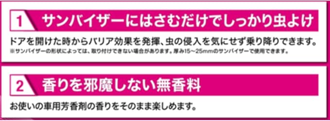 サンバイザーにはさむだけ。サンバイザーにはさむだけ。電源・電池不要でかんたんに虫よけ効果を発揮します。