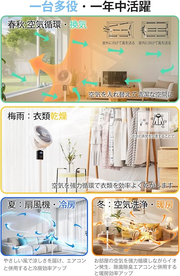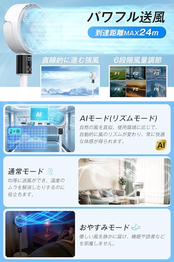 【AIスマート制御&3モード切替&タイマー機能】3つ送風モード(自然風モード/リズムモード/睡眠風モード)があり、その中に、リズムモードとおやすみモードが、Alスマート風量調整システムが搭載し、環境の変化に応じて風量調整が行われます。タイマーON/OFFモード (最大12時間)あります。 電源の切り忘れの心配がないだけでなく、梅雨や花粉の季節には、出勤前にサーキュレーターの空気循環モードをオンにすることで、家中が快適になります。