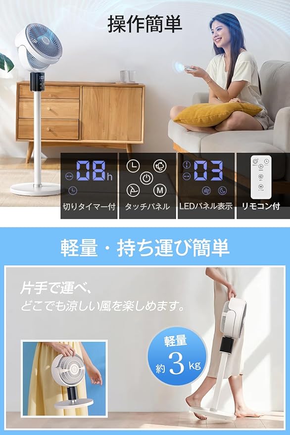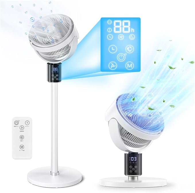 【タッチ操作&リモコン対応&高さ43cm~96cm調整可】タッチセンサー式の操作パネルを採用し、強い力を必要とせず指で軽く触れるだけで簡単に操作可能です。リモコンでもすべての機能を調節可能、広い部屋の隅に置いて使うことも多い場合でも、リモコンで遠くからでも風力や首振り機能を調節できるとサーキュレーターを設置している場所まで移動してから操作せずに済みます。高さ43cm~96cm調整可能なスタンドタイプです、シーンやお好きな高さを調節できる扇風機です。