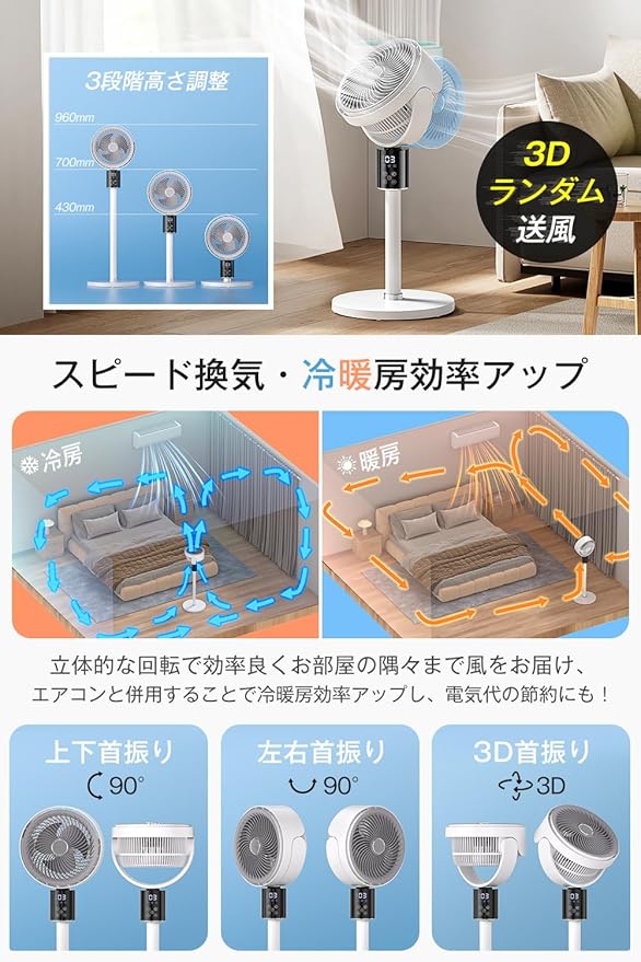 【6段階風量&3D首振りで快適気流】微風から強風まで6段階を調節できます。一番風力が強いモードに設定すると、広いリビングでも問題なく空気循環でき、部屋干し中の洗濯物に風を当てたり、仕切りを挟んで隣接する部屋にも空気を運んだりできます。部屋中の空気をしっかりと循環させたり、部屋干しの洗濯物に風を当てたりとさまざまなシーンで使う場合は、3D首振り機能を備えた、上下の首振り機能は、部屋の上部に溜まりやすい温かい空気と、下部に溜まりやすい冷たい空気を撹拌させ、室温を均一に保つ役割を持ちます(※風量段階の切り替える場合、自然風モードを選んで下さい)。