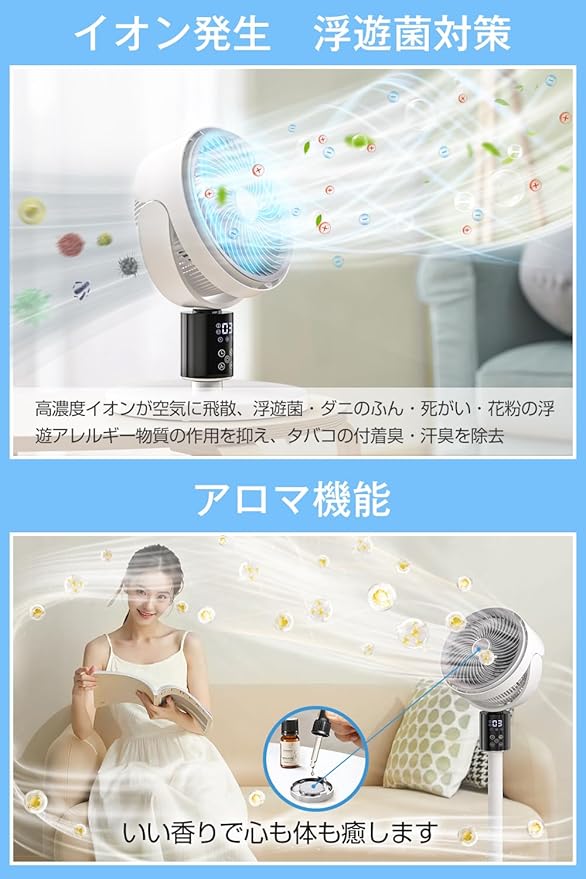 【アロマオイル対応&マイナスイオンで空気質改善】アロマボックスあり、アロマオイル利用可能で、気持ちをリラックスさせ、快適な環境と香りのダブル効果で体と心両方をリラックスしましょう。マイナスイオン機能が付いており、きれいな送風とともにマイナスイオンを放出されて、送風すると同時に、お部屋を綺麗にする効果があり、健康的な生活をサポートする必需品です。