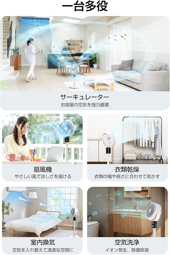 【360度の首振り機能&3種類送風モード&Alスマートシステム】】部屋中の空気をしっかりと循環させたり、部屋干しの洗濯物に風を当てたりとさまざまなシーンで使う場合は、360度の首振り機能を備えた、上下の首振り機能は、部屋の上部に溜まりやすい温かい空気と、下部に溜まりやすい冷たい空気を撹拌させ、室温を均一に保つ役割を持ちます。3つ送風モード(自然風モード/リズムモード/睡眠風モード)があり、その中に、リズムモードとおやすみモードが、Alスマート風量調整システムが搭載し、環境の変化に応じて風量調整が行われます。
