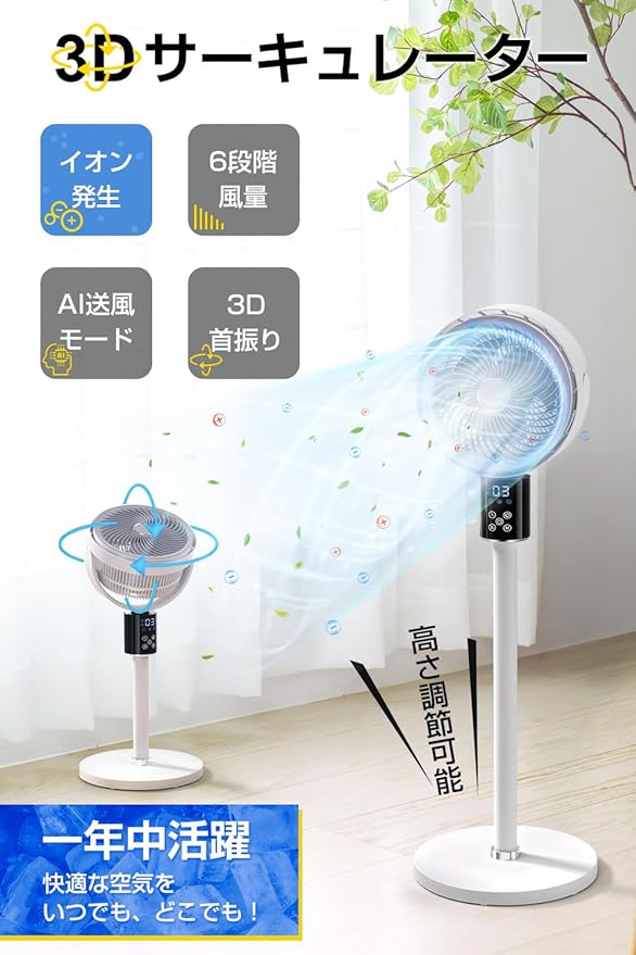 サーキュレーター dcモーター 360度首振り 【2025新設計 & AIスマート風量調整】 リビング扇風機 静音設計 卓上扇風機 上下左右自動首振り 省エネ マイナスイオン機能 空気清浄 三つの送風モード 6段階風量調節 パワフル送風 タイマー機能(1~12) アロマオイル対応 換気/空気循環/部屋干し 梅雨除湿 冷房/暖房 組み立て簡単 PSE認証済 リモコン付き (ホワイト) | oioioichan