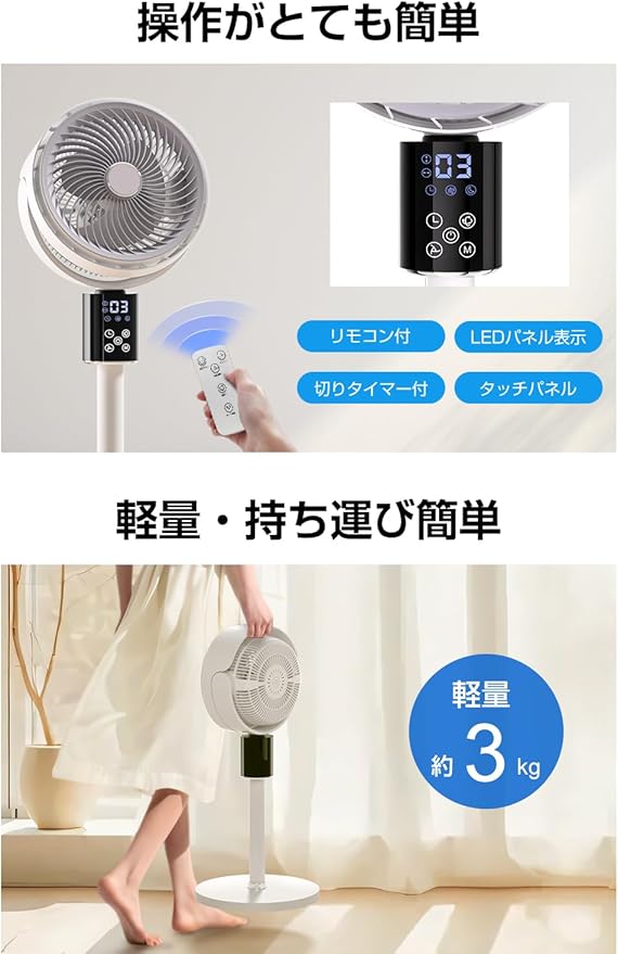 【パッケージ内容】サーキュレーター本体*1、リモコン*1、スタンド*1、延長パイプ*2、取扱説明書兼.書(本紙)*1。365日の.、24時間以内の返信を提供する技術サポートが含まれています。商品の使用中に万が一商品不具合のようでしたら、.の購入履歴より.までご連絡いただければ対応いたします。