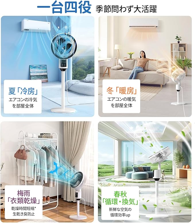 365日空気革命!冷暖房効率UP&空気循環 この一台が季節の悩みをまるごと解決!夏の冷房効率UP/冬の暖房ムラ解消/春の空気循環/梅雨は結露抑制!夏と冬には、サーキュレーターが冷暖房エアコンと連動して作動し、送風力を強化し、長距離送風を実現します。春には、サーキュレーターを使用することで、家全体の気流循環を促進し、空間を新鮮で風通しの良い状態に保つことができる。梅雨時は壁面への集中送風でカビの原因となる結露を軽減し、洗濯物の室内干しも2倍加速!季節の移り変わりに合わせて、空気の質をサポート!快適で健康的な生活をお楽しみください!