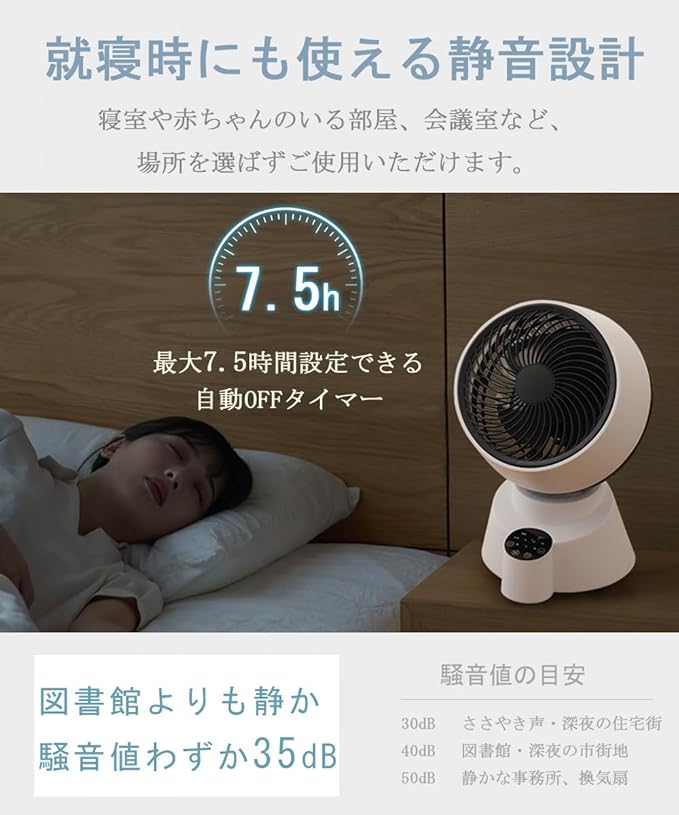 【タイマー機能搭載&リモコン付き】本製品は0.5時間から7.5時間まで自由に設定可能なタイマー機能を搭載し、就寝時も快適にお使いいただけます。タイマー設定により、使用後は自動的にオフになります。 タイマー機能は夜間就寝時に使用することで、運転開始後約60秒で自動消灯し、長時間の運転による電力の浪費を防ぐことができます。本製品にはリモコンが付属していますので、ベッドに横になったままでも、椅子に座ったままでも、簡単に扇風機を操作することができ、走り回るわずらわしさから解放されます!