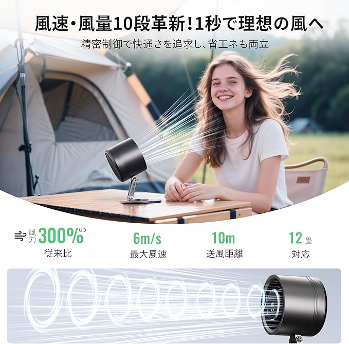 【独自開発の風路構造で最大12畳の空間に対応】デュアルカット風路と高速風筒による独自の構造。内部には7枚の螺旋状羽根を搭載し、高圧タービン風路システムと組み合わせることで、風の流れを強力に加速させます。同クラスの小型プラスチック製サーキュレーターと比較して、風がより集中し、遠くまで届くのが特徴です。最大風速距離は10メートルに達し、パワフルで安定した直線的な風を生み出し、空気の循環と換気を促進し、部屋の温度を均一で快適に保ちます。12畳の広い空間でも、力強い送風と効率的な空気循環を実現し、風力効率は一般的な扇風機の 2 倍以上です。