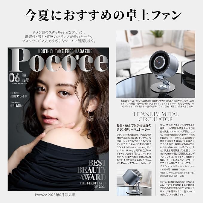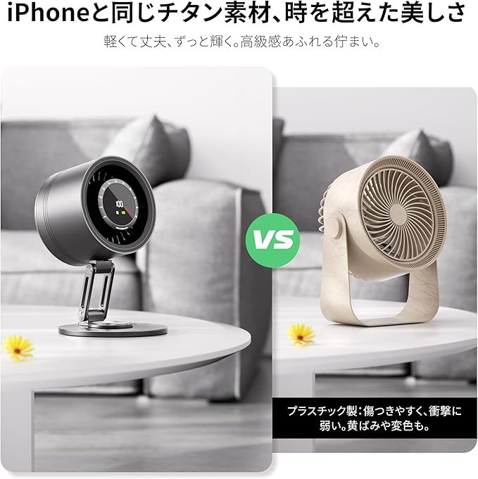 【世界初!チタン金属製サーキュレーター】i-Phoneと同じ航空グレード5チタン合金を用いたフルメタルボディで、軽量かつ頑丈で耐久性に優れ、高級感を放ちます。製品重量はわずか 1248g、寸法は約(179mm 145mm 171mm〜242mm)で、家庭での使用はもちろん、外出時の持ち運びにも負担がありません。フルメタルボディは汚れや指紋がつきにくく、軽く拭くだけで新品のような輝きを取り戻せます。デザイン性と実用性を兼ね備えた、新世代の扇風機の傑作です。