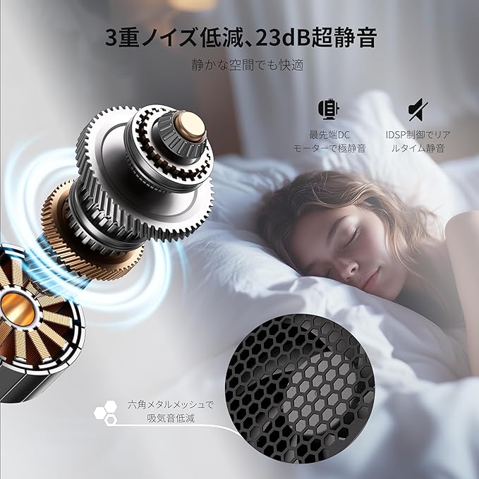 【三重の静音設計で 23dB 以下の超静音】究極の静音性を追求したこの扇風機は、業界最先端の静音性に優れたDCブラシレスモーターを採用し、さらに六角形金属メッシュの吸気口構造を初めて搭載。 この革新的な組み合わせにより、従来のプラスチック製扇風機と比較してノイズリダクション効果が50%向上し、運転音を図書館並みの静けさ、最小風量(01段階)においてわずか23dB以下に抑えています。加えて、先進のIDSPインテリジェントノイズキャンセリング技術を搭載し、リアルタイムでノイズを検知・除去し、さらなる静音化を実現しました。オフィス、図書館、寝室など、静かな環境でも超静音運転を維持し、仕事、勉強、睡眠中に騒音に邪魔されることはありません。