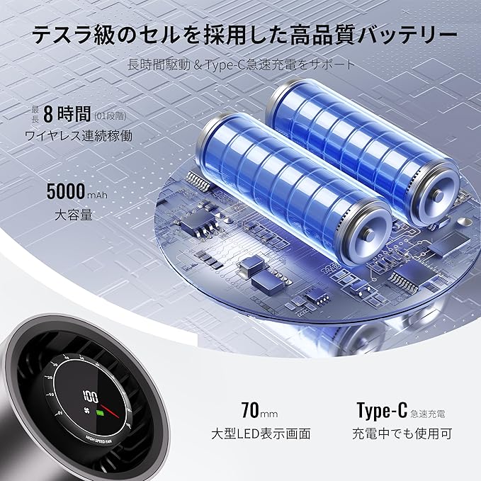 【5000mAh.で最長8時間のワイヤレス稼働】テスラ級のセルを採用した高性能.を搭載。5000mAhの容量は通常のデスクトップファンの2.5倍以上で、.持続時間が大幅に向上しています。最強モード(10 段階)では2.5時間、ECO 省エネモード(01段階)では最長8時間の連続使用が可能で、一日中の長時間使用にも対応します。従来の卓上扇風機の1A充電速度と比べ、この機種は5V-2Aの高速充電に対応しており、充電時間はわずか3.5時間で、ECOモードで一日中使えます。頻繁な充電が不要で、あなたの夏を涼しく快適に過ごせます。さらに、USB Type-C 接続による充電中でも使用可能な機能を備えており、室内や屋外を問わず、多様なシーンで柔軟にご利用いただけます。