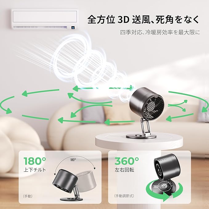 【最先端!360 180 立体送風で、部屋の隅々まで快適に】特許出願中のダブルスイングアーム構造を採用。左右 360 (手動)、上下 180 の全方位送風が可能です。天井や床に向けて送風することで、冷暖房の効率を大幅に向上させ、電気代を節約し、部屋の温度ムラを解消します。折りたたむと体積が 50%減少!高さもわずか 17cm になるため、収納に困りません。一人暮らしの狭い空間にもスッキリ収まります。