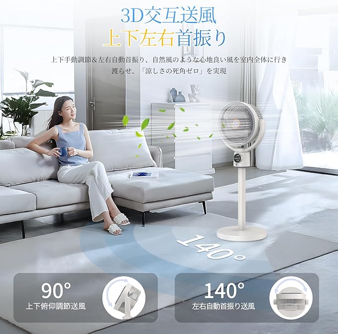 【4段階高さ調整&上下左右に首振り機能搭載】どんなシーンでも大活躍する、この多機能サーキュレーターは、36cm、52cm、68cm、86cmの4段階高さ調整が可能!スマートなスパイラルインターフェイスデザインにより、簡単に高さを切り替えられ、どんな部屋や状況にもぴったりフィットします。上下90 を手働で調節し、ピッチ角度を自在にして、手働で正確に送風します。左右140 自働首振り、組み合わせ140 超広角自働首振り、左右に広い空間を横切り、シームレスに隅々まで涼をカバーさせます!3D大広角の強い送風、伝統的なファンの限界を突破して、立体循環気流が部屋全体を横切ります!強力な風力に広角送風が加わり、サラウンド型のクールストームとなり、蒸し暑さを素早く吹き飛ばし、「死角なし」の爽快な体験が楽しめます。循環扇の中の「空間管理マスター」が快適な新次元を定義します!