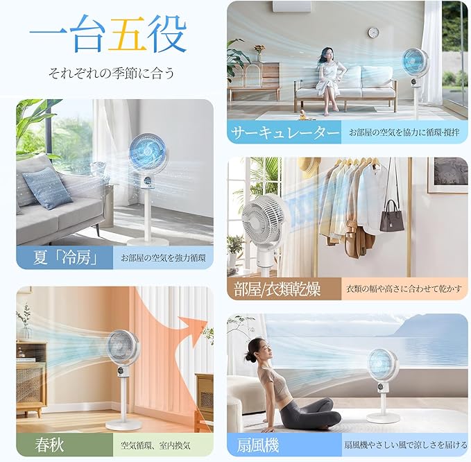 【5段階風量調節&全年用サーキュレーター】微風から、強風まで使用シーンに合わせ自由に5段階風量調節できます。また、リモコン操作にも対応しており、リモコンで電源のオン/オフ、風量調節、タイマー設定、首振り機能などを一括して操作できます。リビングのソファや寝室のベッドからでも快適に操作が可能です。部屋用扇風機のみでの使いやすさはもちろん、換気、衣類乾燥・部屋干しや空気循環を行うさーきゅれーたーとしても使える1台多役仕様です。最大風速6m/sまでパワフル送風を実現!猛暑対策、梅雨、除湿、季節を問わず1年間フル稼働できる優れモノです。環境に応じて切り替えることができ、強力な風で夏の暑さを吹き飛ばし、一年中快適に使用できるエアサーキュレーター扇風機です。