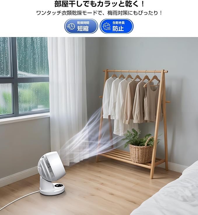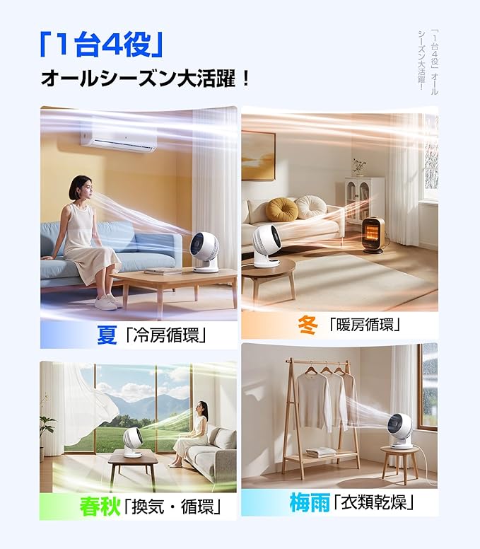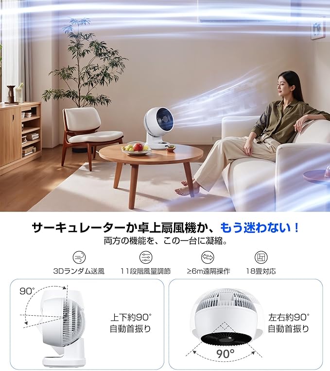 ❄️【360 立体送風&11段階風量調節】本サーキュレーターは、上下左右90 の自動首振り機能を搭載し、天井から床まで空間全体に立体的な3D気流を届けます。どこに置いても、360 全方向に快適な風をお届け。お部屋のどこでも心地よい風を感じられます。11段階の風量調節が可能で、衣類乾燥モードも含め、季節やシーンに合わせて最適な風を自由に選べます。真夏の暑さ対策、冬場の暖房効率アップ、春秋の空気循環、梅雨時の衣類乾燥まで、1年中大活躍!パワフルな直進風で空気をしっかり循環させたいときも、赤ちゃんやご高齢の方にはやさしい微風モードでやさしく風を届けます。まるで自然の風のようなやわらかい不規則な風が、お部屋をやさしく包み込みます。リビングでのリラックスタイム、寝室での就寝、オフィスでの仕事時間など、さまざまなシーンで快適な空間づくりに役立ちます。
