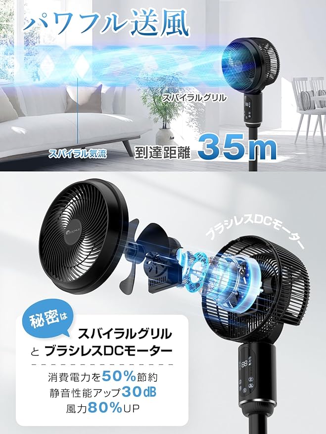 【高性能ブラシレスDCモーター搭載&驚異の静音性】 高品質ブラシレスDCモーターを搭載!✨ 消費電力50%削減で省エネ効果抜群!✨ 最高回転数1900rpmを実現し、広い空間(最大45畳)でも強力な風を提供!✨ **驚異の静音性(30dB)**で、夜間や静かな環境でも快適に使用可能!さらに、特殊設計の立体羽根とメッシュカバーにより、運転効率を向上させ、摩擦を低減し。安定性と静音性を両立したサーキュレーターで、快適な空間を手に入れよう!