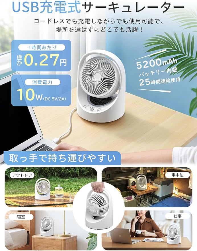 【コードレス式&コンパクトサイズ】この扇風機は5200mAhの.を内蔵して、コードレスで25時間連続使用可能になります。USB充電式設計により、扇風機は電源コードに縛られることなく自由に移動でき、場所を選ばず使用可能です。USB-C充電対応で、シンプルで便利な充電方式を実現し、充電しながらの使用も可能です。新技術の充電式.を採用しており、充電しながら使用しても.寿命に影響を与えず、サーキュレーターの耐久性を大幅に向上させています。せんぷうきは約1kgの軽量設計で、片手で簡単に持ち運びやすいです。オフィスや寮、アウトドアのキャンプなど、どこにでも手軽に持ち運べます。