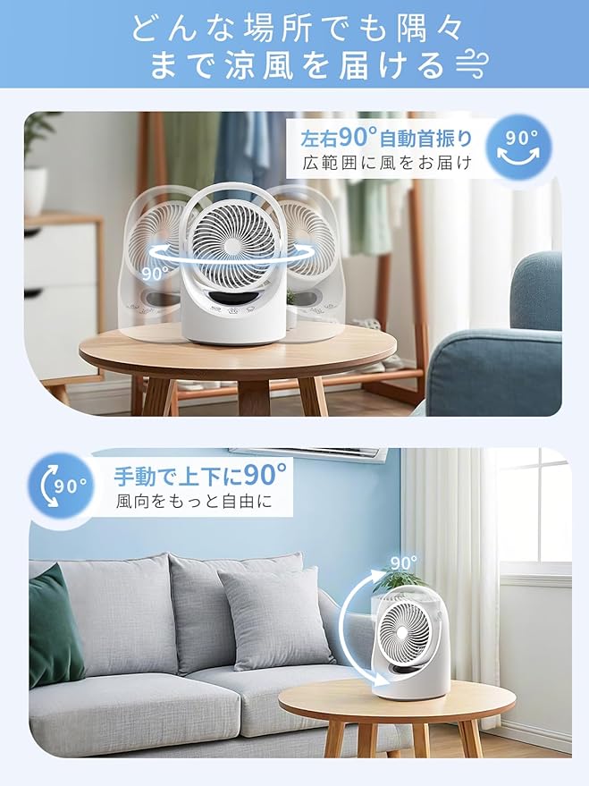 【左右自動首振り・上下角度手動調整】当社のサーキュレーターは左右90 の自動首振り機能を搭載しており、頻繁に手動で位置を調整する手間が省けます。また、上下90 の手動調節が可能で、座っている姿勢や寝転んでいる姿勢に合わせて、風を快適な位置に送ることができます。