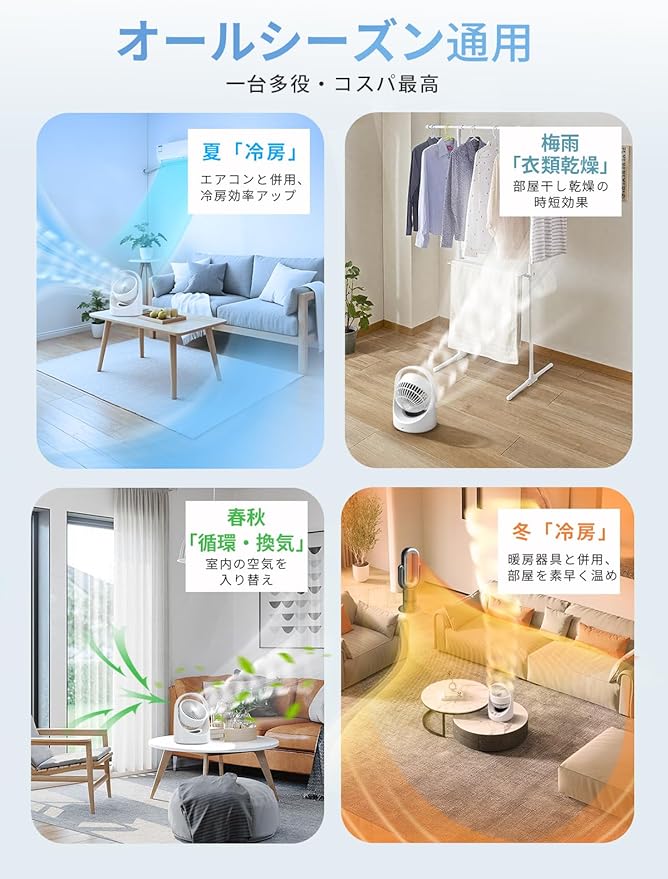 商品の推奨用途 冷房と併用、節電しながら冷房効率アップ, 梅雨季節に部屋干し、乾燥, 春秋季節に換気, 冬にヒーターと併用、暖風を拡散