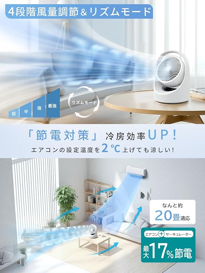 扇風機 サーキュレーター 兼用 充電式【2025年夏新モデル・節電対策・.内蔵】DCモーター 静音 パワフル せんぷうき扇風機 上下調節 左右自動首振り 小型 卓上 リビング 省エネ 20畳 4段階風量 リズム風モード 1-7Hタイマー機能付き 換気 空気循環 部屋干し 冷房/暖房 | oioioichan