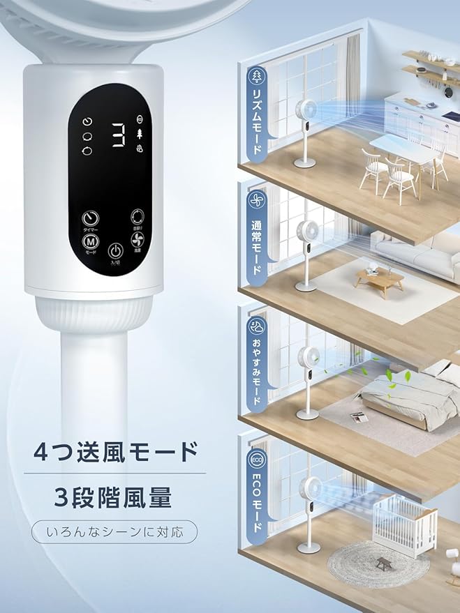 【3段階風量と4つのモードで自在に調節】サーキュレーターは微風からパワフルな風まで3段階の風量調節で、暮らしにぴったりの快適さをお届けします。運転モードは「通常」「リズム」「おやすみ」「ECO」の4種類:「通常モード」は毎日の幅広いシーンに、「リズムモード」は自然の風のような心地よい変化を楽しめます。「おやすみモード」は徐々に風を弱める設計で睡眠を優しくサポート。「ECOモード」なら室温に合わせて自動で風量を調整し、無駄のない省エネ運転を実現します。