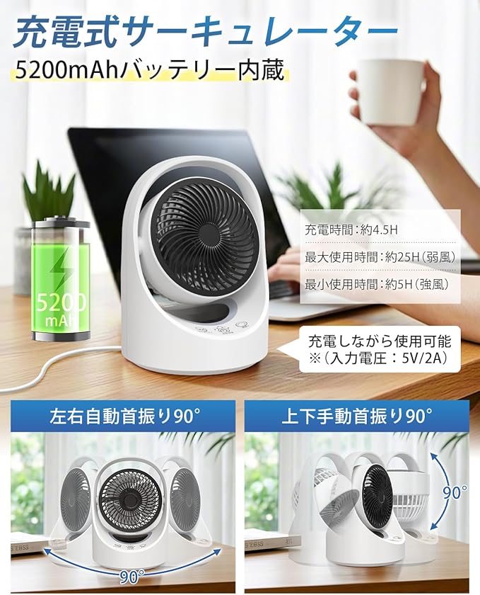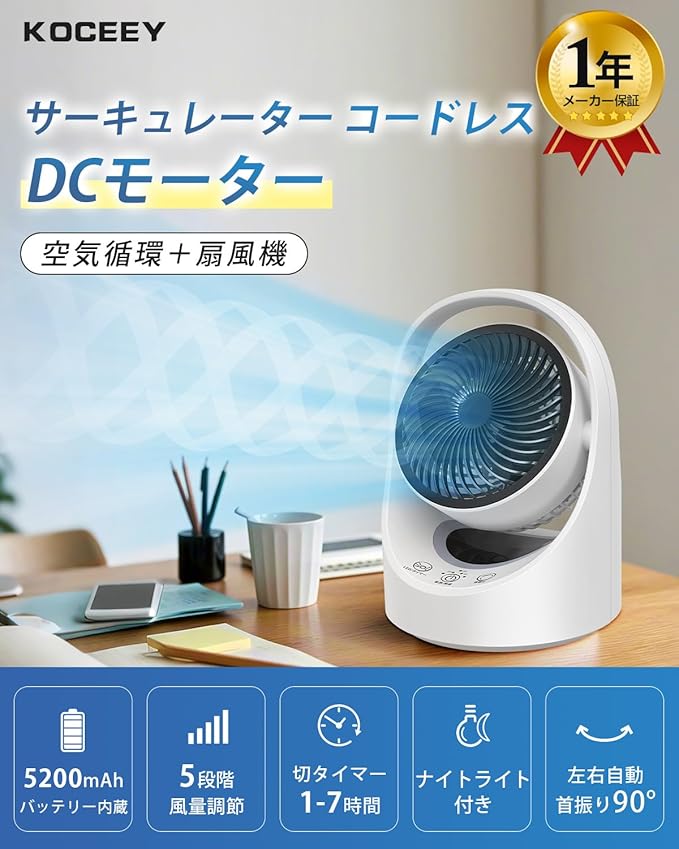 サーキュレーター コードレス 充電式 扇風機 兼用 DCモーター 静音【節電対策&最大25時間運転】USB 5200mAh. パワフル送風 5段階風量調節 左右首振り 上下角度調節 1-7時間切タイマー 省エネ コンパクト 小型 ライト付き アウトドア用/キャンプ用/車中泊/換気/空気循環/部屋干し/衣類乾燥/梅雨除湿/冷房/暖房 日本語取扱説明書付き | oioioichan