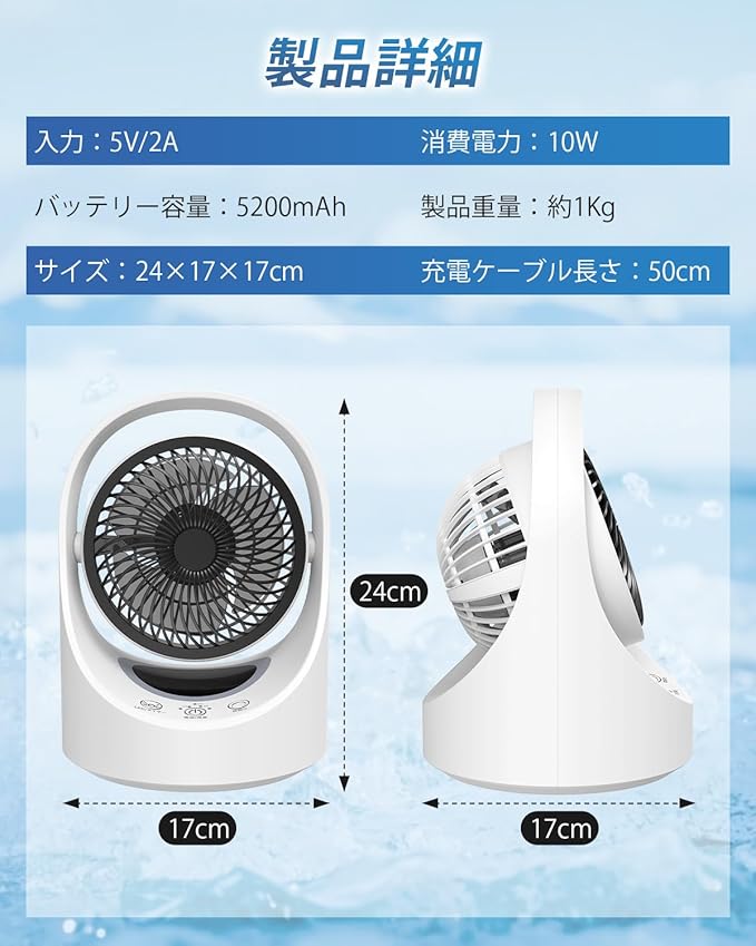 ✅【1年間の安心.&パッケージ内容】●サーキュレーター扇風機サイズ:約幅24 奥17 高さ17cm ●重量:約0.8kg ●充電ケーブル長さ:約115cm「充電の際、必ずDC5V/2Aの充電器(別売り)を使ってください。」 ●消費電力: 10W ●パッケージ内容:サーキュレーター 1、充電ケーブル 1、日本語取扱説明書 1。お買上げから、最大1年間の.付き、万が一、初期不良や自然故障など不具合が応じた場合、「連絡方法」1、取扱説明書で記載している連絡先までご連絡ください。2、「アカウントサービス」>「注文履歴」>「」>「質問する」遠慮なくご連絡ください。