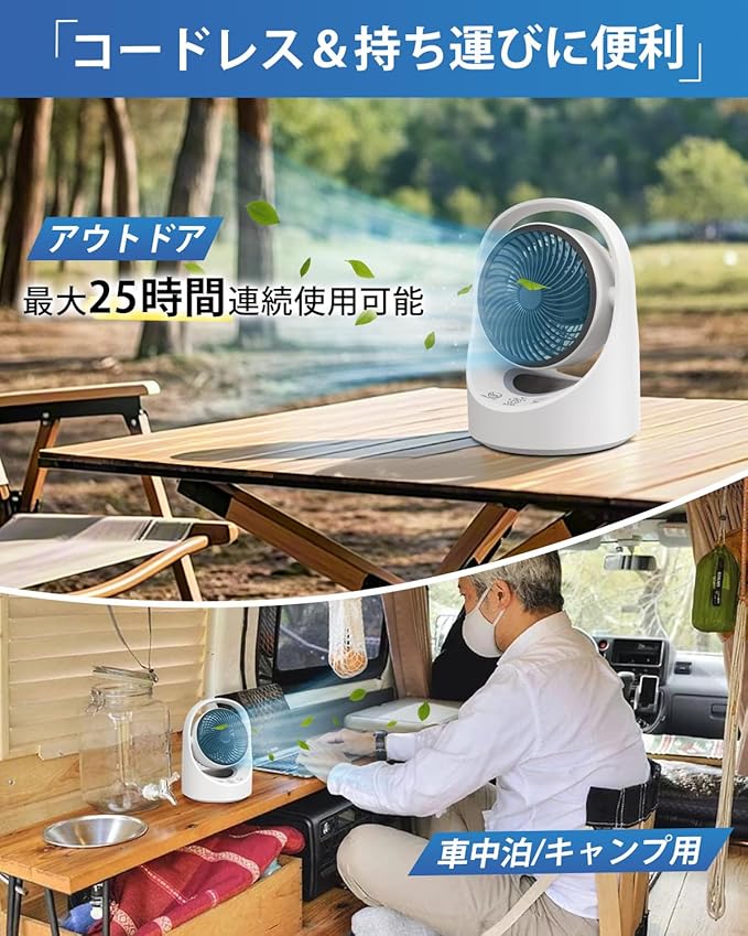 ✅【サーキュレーター扇風機兼用&大容量.&アウトドア対応】サーキュレーターが大容量5200mAh内蔵.で、最大25時間(※フル充電で弱モード時)の連続使用が可能(風量設定により異なります)。充電式サーキュレーターなので、夏場のキャンプと暑さが厳しい日には、熱中症対策に役立つ。地震や停電時でもコード不要で室内換気、空気循環をサポートします。サーキュレーター.内蔵で、エアコンなし車中泊に使うには最適です。車中泊で食事やTVを見たりする際には、車内の空気を効率よく循環させます。更に、ライト付きで、車内の雰囲気をアップさせるだけでなく、物を探すときに照明の代わりにもなるので便利です。「★★★ご注意:充電の際、必ずDC5V/2Aの充電器(別売り)を使ってください。充電しながら使用は可能ですが、充電の際、風量が少し弱くなりかもしれません、これは正常です、気になる場合、満充電してから使用してください。