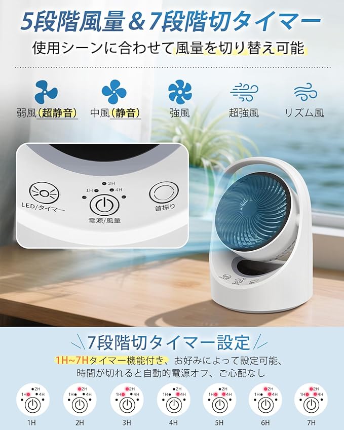 ✅【5段階風量調節&7段階切タイマー】サーキュレーターは弱/中/強/超強/リズム風5段階の風量調節、オフィスでの作業、睡眠時、運動後などシーンに合わせて最適な風量を選択できます。左右自動首振り約90度と上下約90度を手動調節、天井や足元など狙った方向に風を送れます。広範囲に空気を循環させ、夏は涼風、冬は暖房の効率化に、季節を問わず活用できます。草原に吹く風のようなやわらかい風で、長時間当たっていても鬱陶しく感じしません。1~7Hの7段階切タイマー付き(設定時間は点灯ランプの時間数の合計となる。設定単位:1時間)。就寝中や外出後に数時間だけ使用する場合に便利。数時間後に自動で電源がオフになり、電源の消し忘れを防止します。