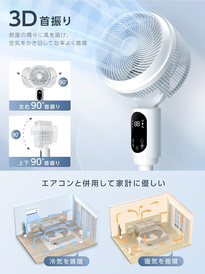 【一台多役サーキュレーター・360度首振り】サーキュレーターは季節の移り変わりとともに、さまざまな体験をもたらします。夏場には扇風機としての利便性はもちろん、冬場には暖房器具と組み合わせて、暖かい空気を部屋全体に均等に広げます。初春や梅雨の季節には換気・衣類乾燥・部屋干し・空気循環など様々な用途に対応できる1台多役仕様です。また、上下、左右90 首振りと3D回転(上下左右同時)に設定可能、風の流れが立体的で全方向に広がり、より良い空気循環効果を実現します。